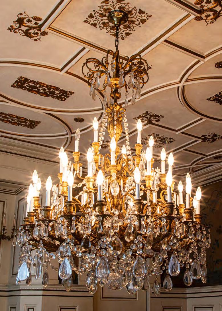 61. Louis XVI-Style Bronze SixteenLight Chandelier, vasiform standard cast with trophees and female busts and masks, foliate arms, h. 52 in., dia. 36 in. [$1500/2500]