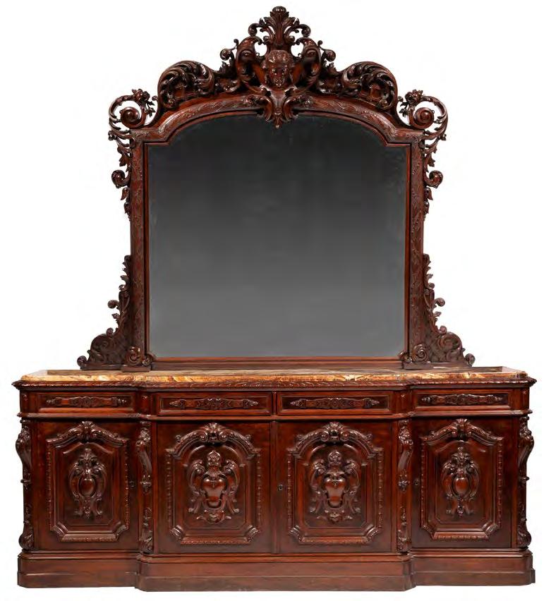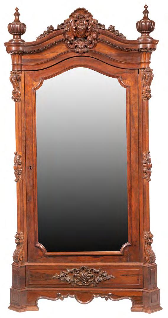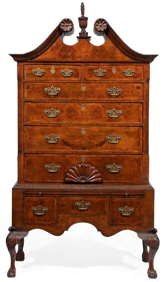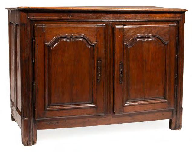 67. French Provincial Carved Walnut Buffet a Deux Corps, 18th c., arched cornice, frieze carved with a drafter’s medallion, scrolled cartouche doors, medial drawers, serpentine apron, cabriole legs, h. 94 in., w. 55 1/2 in., d. 23 in. [$1500/2500]