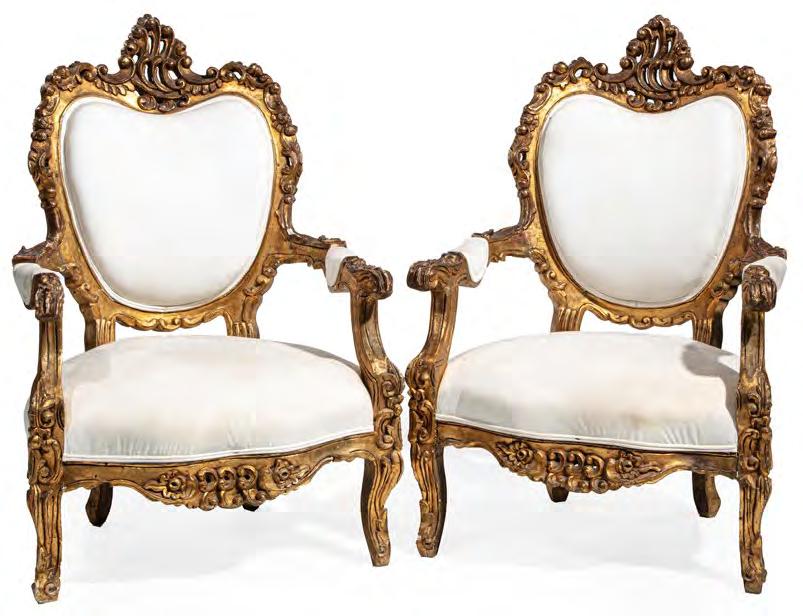 50. Pair of Antique Italian Rococo-Style Giltwood Armchairs, pierced rocaille crest, heart-shaped padded back, scrolled arms, conforming apron, cabriole legs, h. 48 in., w. 30 in., d. 25 in. [$800/1200]