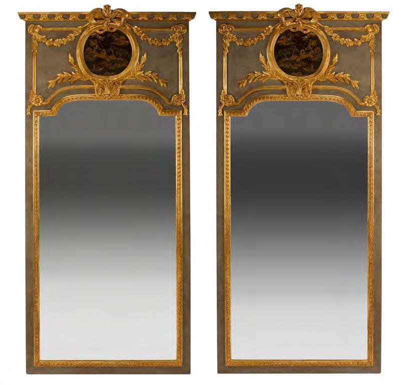 14. Pair of Louis XVI-Style Painted and Parcel Gilt Trumeau Mirrors, cabochon cornice, swagged chinoiserie reserve, cartouche mirror plate, foliate decoration, h. 94 in., w. 44 in. [$1000/2000]