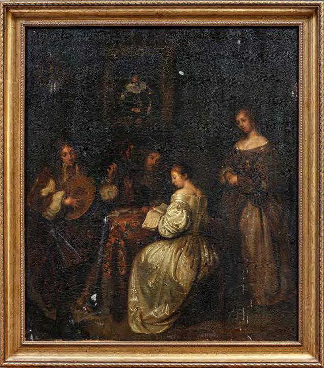 32. Continental School, 19th c., “Genre Scene”, oil on panel, unsigned, 19 7/8 in. x 17 1/2 in., framed, overall 22 1/2 in. x 20 in. x 1 1/8 in. [$300/500]