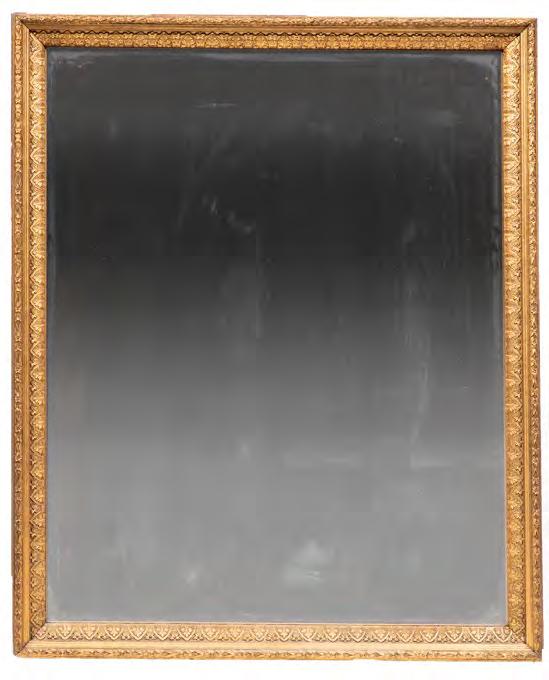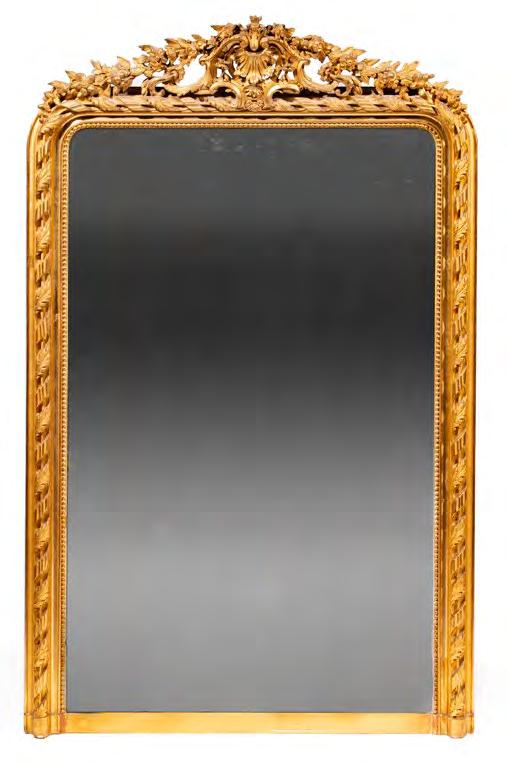 1. Louis XVI-Style Giltwood Overmantel Mirror, 19th c., reticulated floral crest, foliate finials, arched beveled mirror plate, beaded surround and liner, acanthus and pinecone corners, h. 75 in., w. 48 in. [$800/1200]
