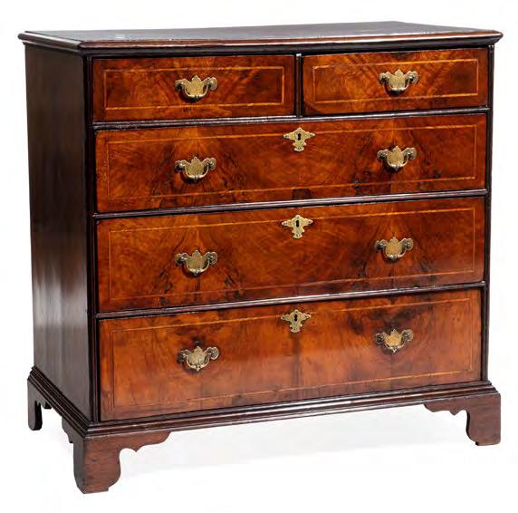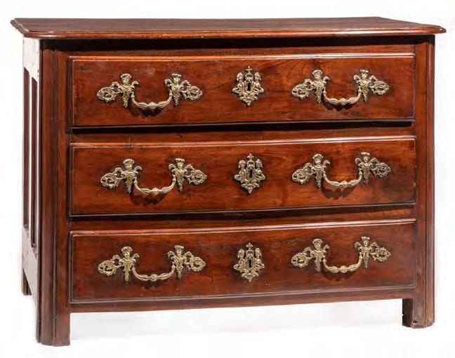 66. Regence Bronze-Mounted Carved Walnut Commode, early 18th c., molded top, quarter column stiles, three drawers, paneled returns, h. 35 in., w. 50 1/2 in., d. 25 in. [$1200/1800]