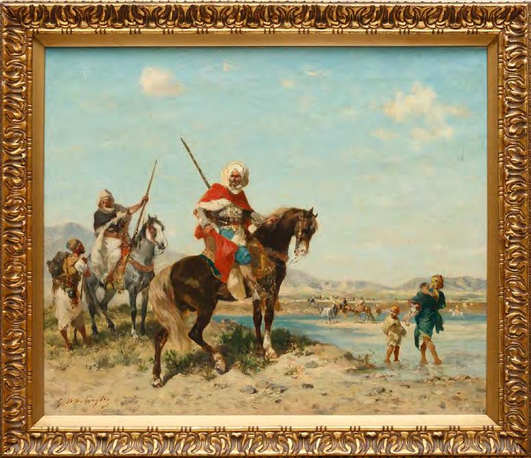 20. Georges Washington (French, 1827-1910), “Horsemen by an Oasis”, oil on canvas, signed lower left, 18 1/4 in. x 21 3/4 in., framed, overall 25 in. x 21 1/2 in. x 1 1/2 in. [$4000/6000]