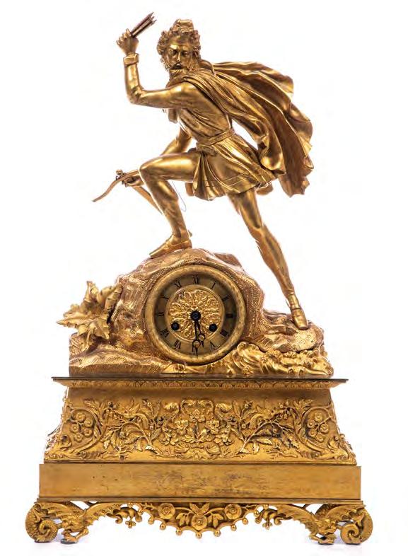17. Napoleon III Gilt Bronze “William Tell” Mantel Clock, 19th c., caped figure holding a crossbow, silk thread striking bell movement, h. 19 in., w. 12 1/2 in., d. 4 1/4 in. [$700/1000]