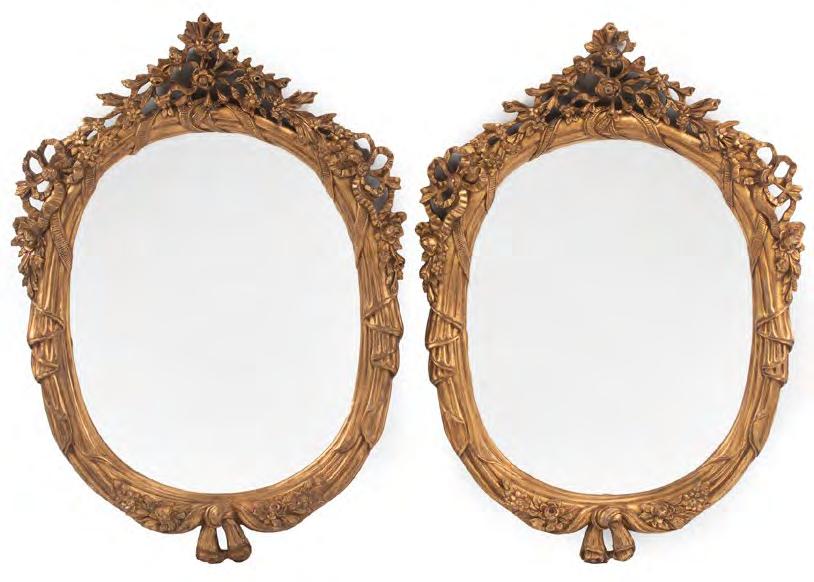 48. Pair of Italian Rococo-Style Carved Giltwood Oval Mirrors, draped surround surmounted by a floral swag crest, h. 49 in., w. 33 in. [$800/1200]