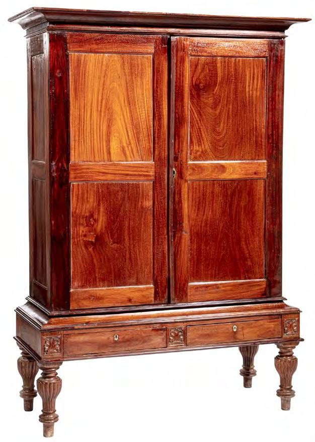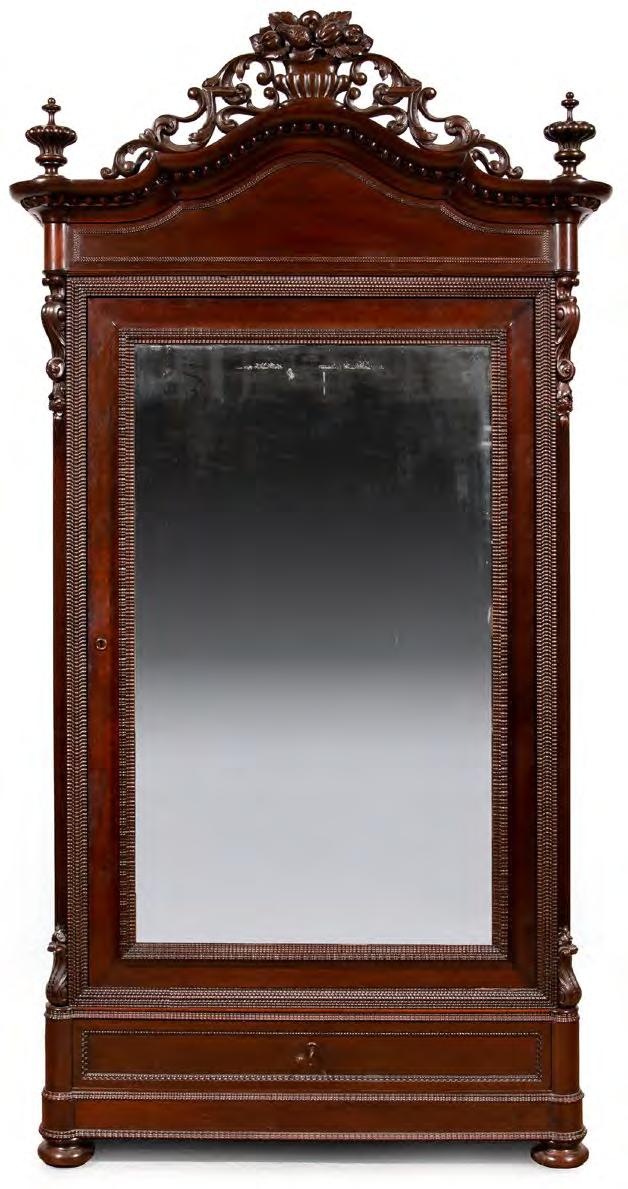 64. Antique French Provincial Two-Part Mixed Woods Document Cabinet, upper case with arched cornice, cartouche-paneled doors, fluted stiles, deep lower case with paneled doors, interior fitted with document drawers, h. 93 in., w. 65 in., d. 39 in. [$1000/1500]