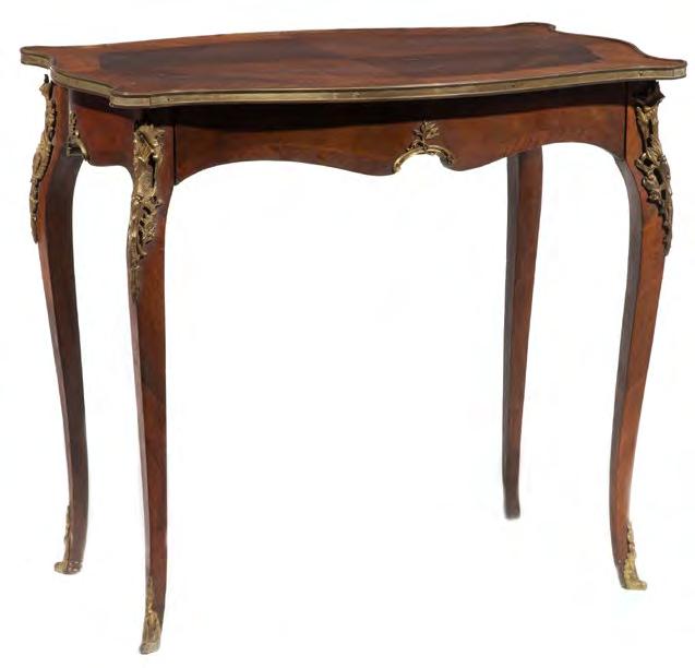4. Antique Louis XV-Style Bronze Mounted Kingwood and Parquetry Occasional Table, turtle top, serpentine blind frieze drawer, cabriole legs, sabots, h. 29 in., w. 31 1/2 in., d. 21 in. [$700/1000]