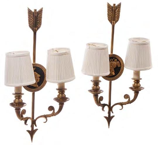 58. Four Empire-Style Gilt and Patinated Bronze Two-Light Sconces, arrow backplate, mounted with a medallion of a centurion, h. 19 1/2 in., w. 10 in., d. 4 in. [$700/1000]