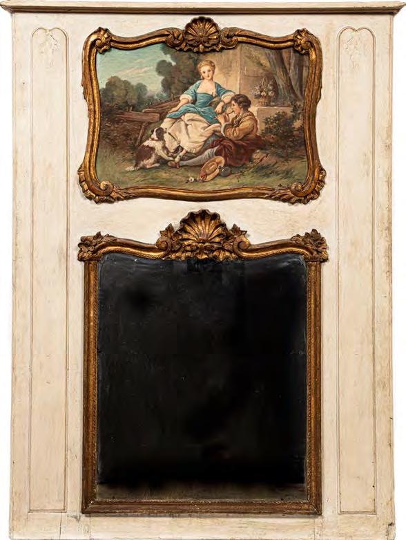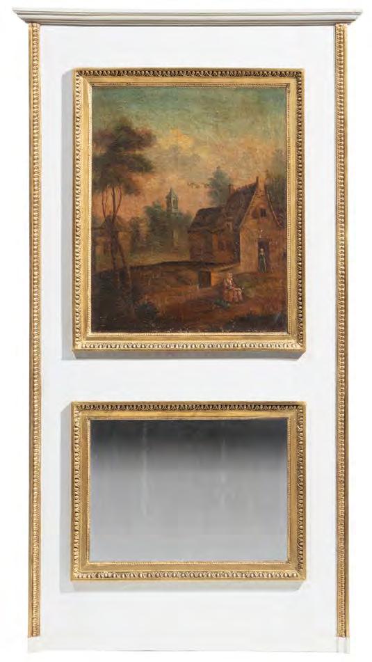 6. Louis XVI-Style Creme Peinte and Parcel Gilt Trumeau Mirror, molded cornice, village scene reserve, egg and dart molding, h. 73 in., w. 40 in. [$1000/1500]