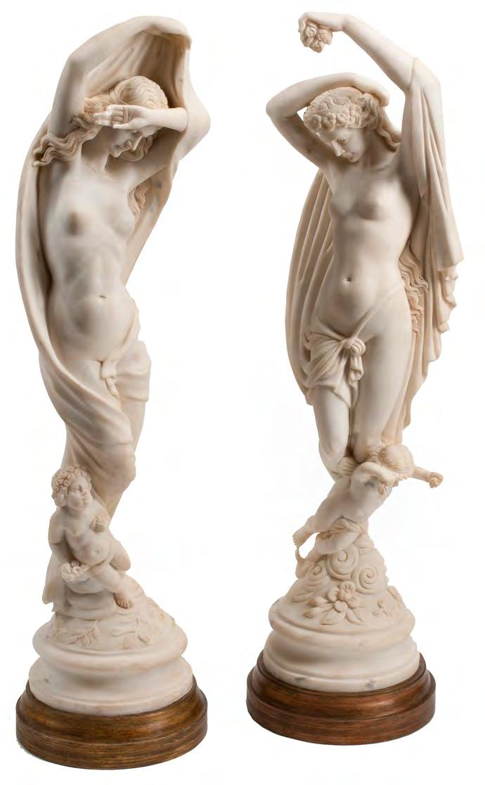 31. Pair of Carved Marble Figures of Maidens with Putti, each draped maiden with cherub attendant, h. 38 1/2 in., w. 11 in., d. 10 in., bronze bases, overall h. 41 in. [$2000/4000]
