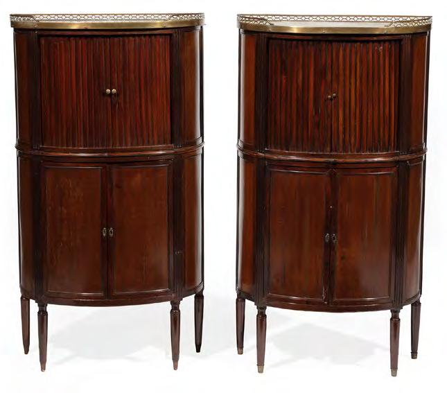 46. Pair of French Neoclassical Bronze-Mounted Mahogany Demilune Tall Commodes, early 19th c., galleried inset marble top, upper case with tambour door and fitted interior, lower case with shelf interior, tapered legs, brass cuffs, h. 43 3/4 in., w. 24 1/2 in., d. 12 1/2 in. [$4000/6000]
