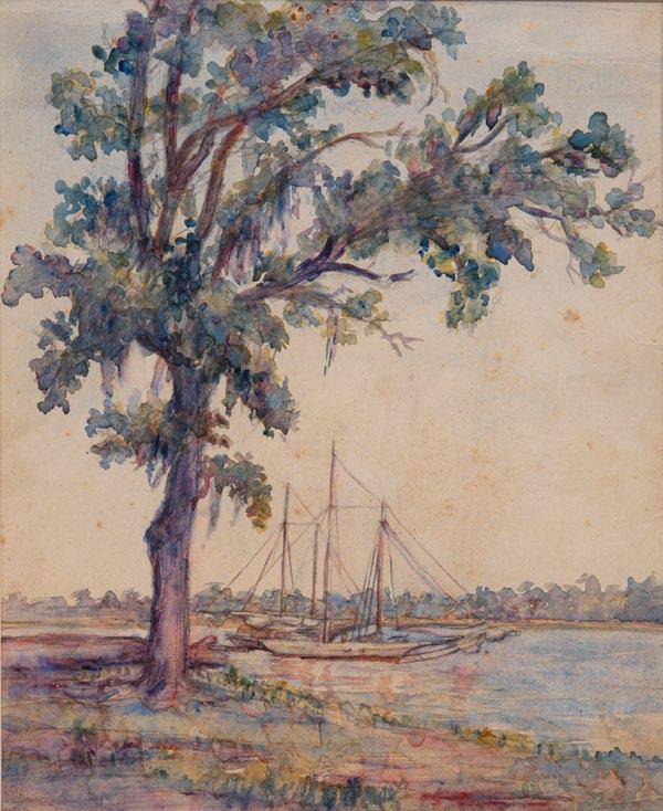7. Emilie de Hoa LeBlanc (American/Louisiana, 1870-1941, active Newcomb College, 1897-1921), “On the Bayou”, graphite and watercolor on paper, initialed “E” lower left, partial sketch en verso, handwritten label with title on backing paper, 10 5/8 in. x 7 3/8 in., framed, overall 14 7/8 in. x 12 7/8 in. x 1 1/4 in. [$800/1200]