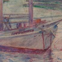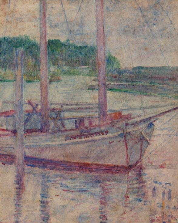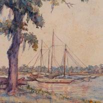 6. Marie de Hoa LeBlanc (American/Louisiana, 1874-1954, active Newcomb College, 1895-1914), “The Schooners”, graphite and watercolor on paper, signed, titled and inscribed en verso, 2 labels with artist, one with title, on backing paper, 10 5/8 in. x 9 7/8 in., framed, overall 14 7/8 in. x 12 7/8 in. x 1 1/4 in. [$800/1200]
