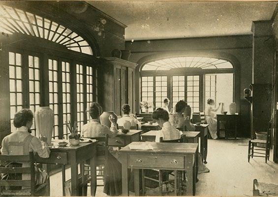 4. Newcomb College Art Pottery Vase, 1930, decorated by Anna Frances Simpson with a reliefcarved moon and moss laden cypress tree design, base marked with Newcomb cipher, decorator’s mark, Jonathan Hunt’s potter’s mark, shape no. 326 and reg. no. SE16, h. 6 3/4 in., dia . 3 in. 5. Newcomb College Art Pottery Vase, 1919, decorated by Sadie Irvine, matte glaze, with a reliefcarved design of sapling oaks, the base marked with Newcomb cipher, decorator’s mark, Joseph Meyer’s potter’s mark, reg. no KQ5 and shape no. 240, h. Pottery decorating class, Newcomb College Pottery Building, Washington Avenue Campus, New Orleans, LA. 1905 Newcomb Art School Scrapbook, University Archives, Tulane University