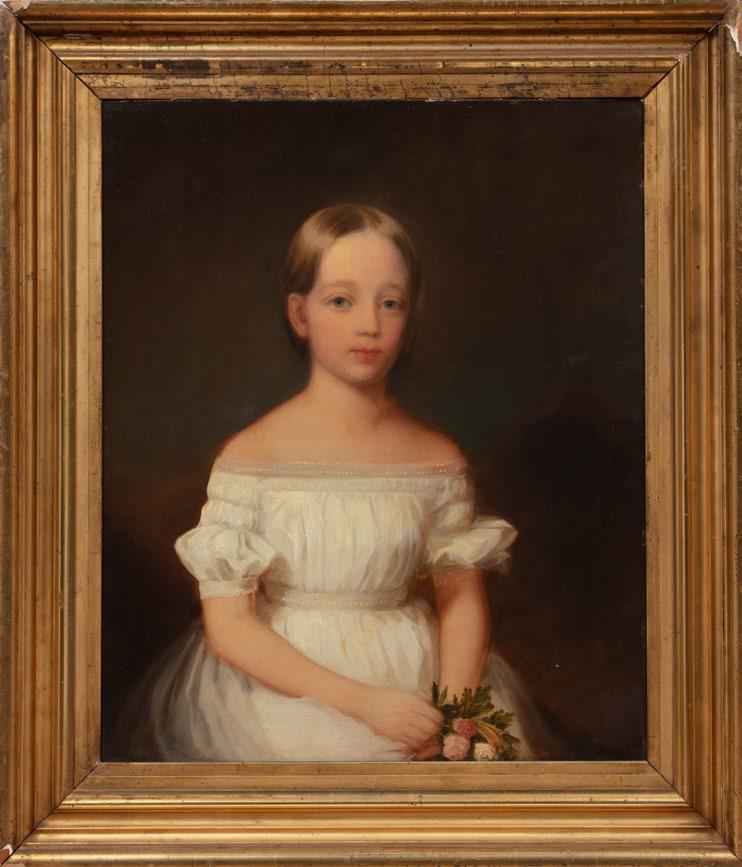 Note: The two portraits offered here depict father and daughter Van Perkins Winder (1809-1854) and Elizabeth Rowan Winder (1834-1842). Van Perkins Winder was born in 1809 into a family originally from Tennessee, which is likely where he met his wife, Martha Grundy. Grundy was the daughter of Felix Grundy, congressman, U.S. senator from Tennessee, Attorney General under President Martin Van Buren from 1838 to 1839 and political advisor to Andrew Jackson. Shortly after Winder and Grundy’s marriage, the couple moved to Schriever, Louisiana in Terrebonne Parish. In 1845, they acquired Ducros Plantation, however the mansion was built by his widow after Winder died from yellow fever in 1854. Construction was completed in 1860 and modeled after The Hermitage, Andrew Jackson’s plantation home in the Winders’ native state of Tennessee. Martha and Van Perkins Winder had fifteen children, several of whom did not live to adulthood, including their daughter Elizabeth, born in Schriever in 1834. Elizabeth died at the age of eight in 1842 a little less than a month before her sister Margaret who was ten. The proximity of the girl’s death dates, in the summer, during a time when yellow fever ran rampant, suggests that Elizabeth and Margaret likely died from the same illness that would take their father nearly a decade later. The artist responsible for these two portraits is unknown, however the lovingly detailed works show a skilled hand in portraiture. The two sitters’ gentle expressions mirror one another in a way that suggests their familial relationship. Their finely rendered clothing offers contrasting textures from the sheer quality of Elizabeth’s puffed sleeves to the shine of Van