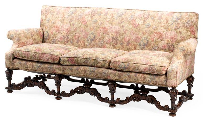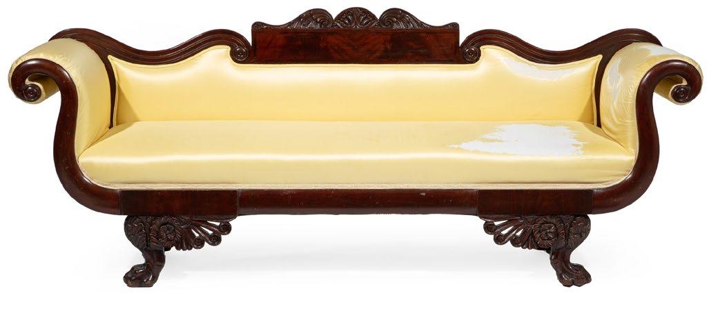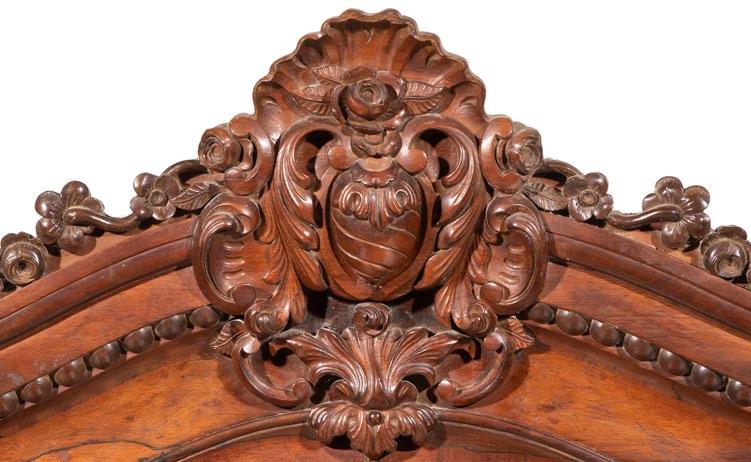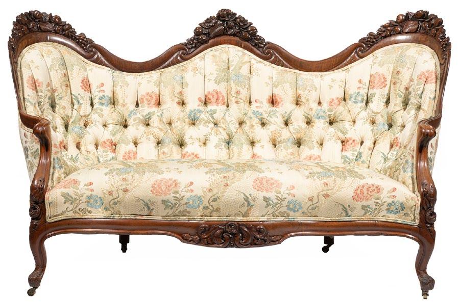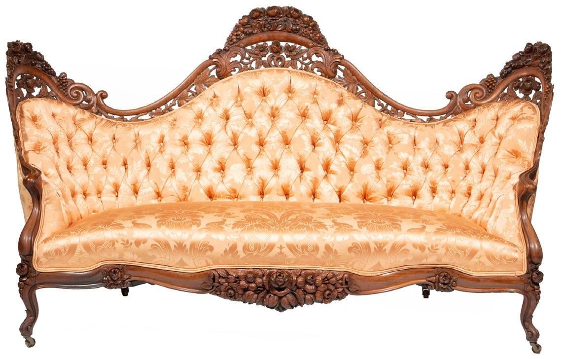 4. Very Fine American Rococo Carved and Laminated Rosewood Sofa, c. 1850-1860, attr. to John Henry Belter, New York, in the pattern commonly referred to as “Fountain Elms”, arched back surmounted by finely carved floral crests, undulating reticulated foliate crest rail, tufted seat back, scrolled arms, highly carved floral seat rail, cabriole legs, casters, h. 47 in., w. 84 in., d. 36 in. [$10000/15000]