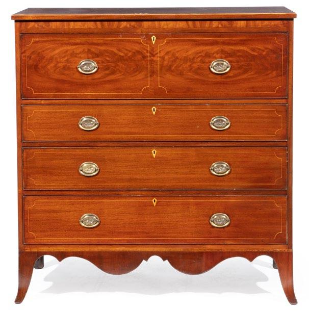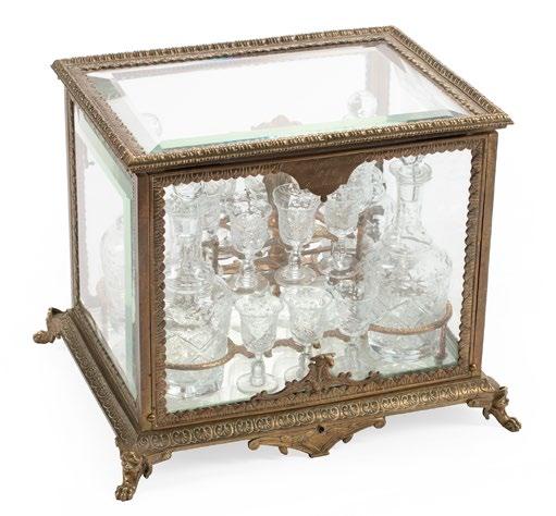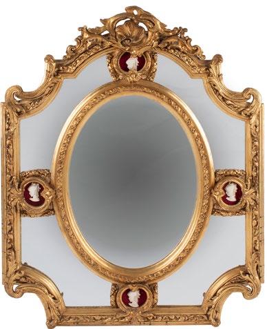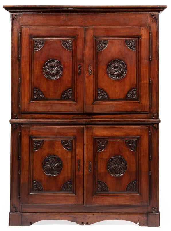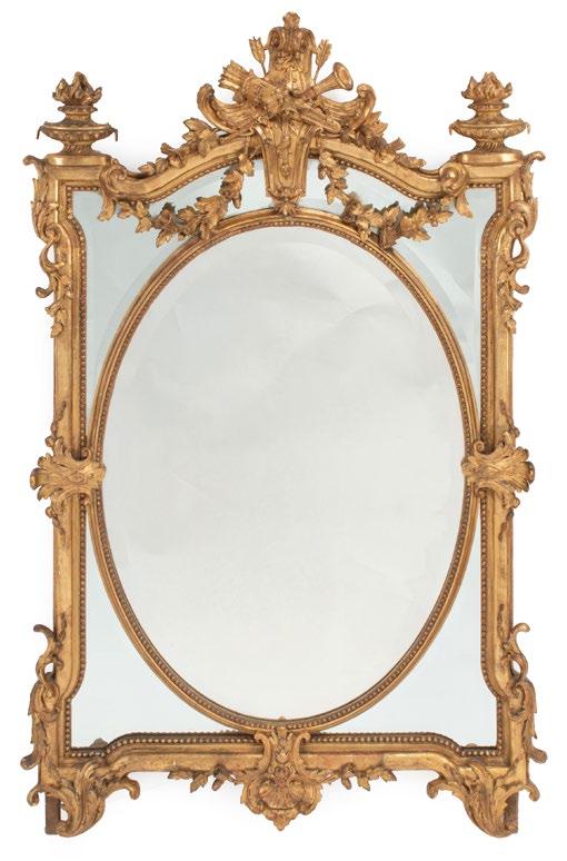 New Orleans, closely related to the Lansdowne group, later crest, lobed finials, egg and dart molding, mirrored doors, ribbon-molded surround, shelf interior, stiles with foliate scrolled bracket, conforming base, disc feet, h. 114 in., w. 72 in., d. 26 1/2 in. [$4000/6000]