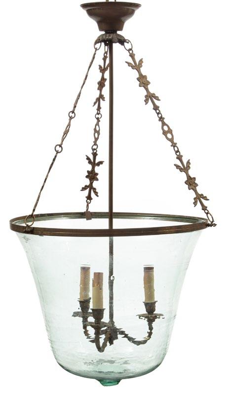23. Large American Blown Glass Hall Lantern, 19th c., green-tint glass, foliate supports, h. 18 in., dia. 32 in. [$600/900]