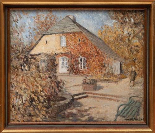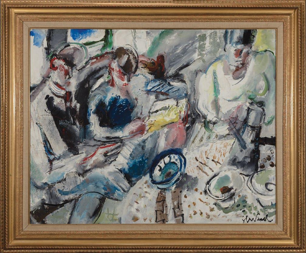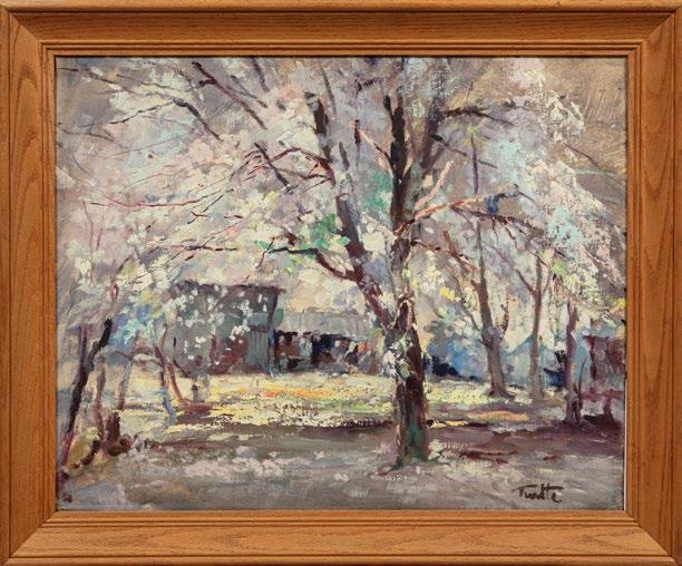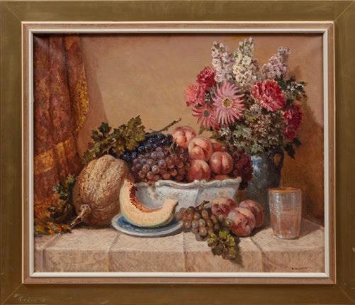 46. Leon Moran (American, 1864-1941), “The Reading Lesson”, oil on canvas, signed lower right, artist name inscribed on stretcher, artist biography on reverse of frame, 20 in. x 30 in., framed with title plaque, overall 29 1/2 in. x 39 1/2 in. x 4 in. [$700/900]