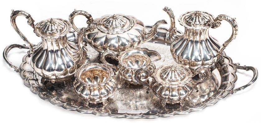 40. Assembled Elizabeth II Sterling Silver Seven Piece Coffee and Tea Service, Barker Brothers Silver, Ltd., Birmingham, 1952-1968, incl. 2 coffee pots (h. 8 7/8 in. and 8 1/2 in.), teapot, covered sugar, creamer, waste bowl and tray (30 1/8 in. x 19 in.), lobed forms with acanthus and husk handles, shell and leaf feet, tray with lobed rim, reeded loop handles and flat chased well, total wt. 304.75 troy ozs. [$4000/6000]
