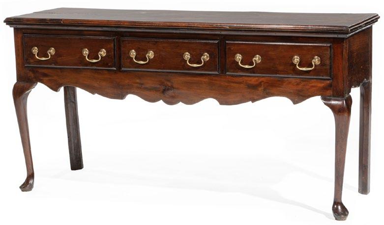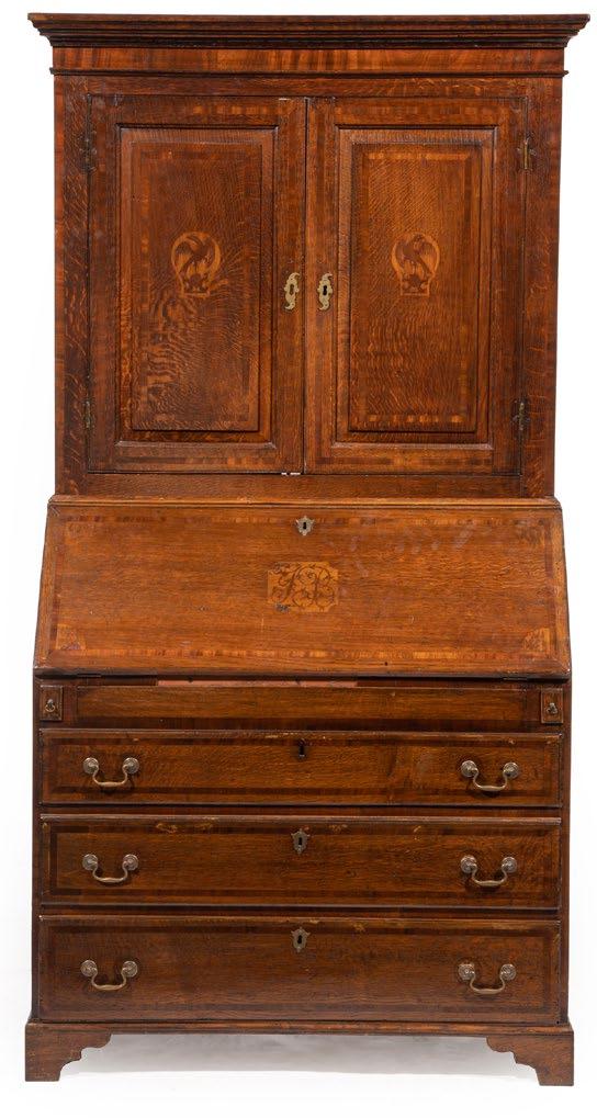 37. Georgian Sheffield Plate Meat Dish with Domed Cover, c. 1800, cover with engraved crest in inset silver shield, motto “Fortiter et Prudenter” (Boldly and Prudently), acorn, oakleaf and branch handle; well and tree meat dish with bound reed border, hot water compartment with reeded and foliate handles; dome interior, dish underside and warming stand interior all retain original tinned surfaces; overall h. 14 1/2 in., l. 26 1/4 in., d. 17 3/4 in. [$800/1200]