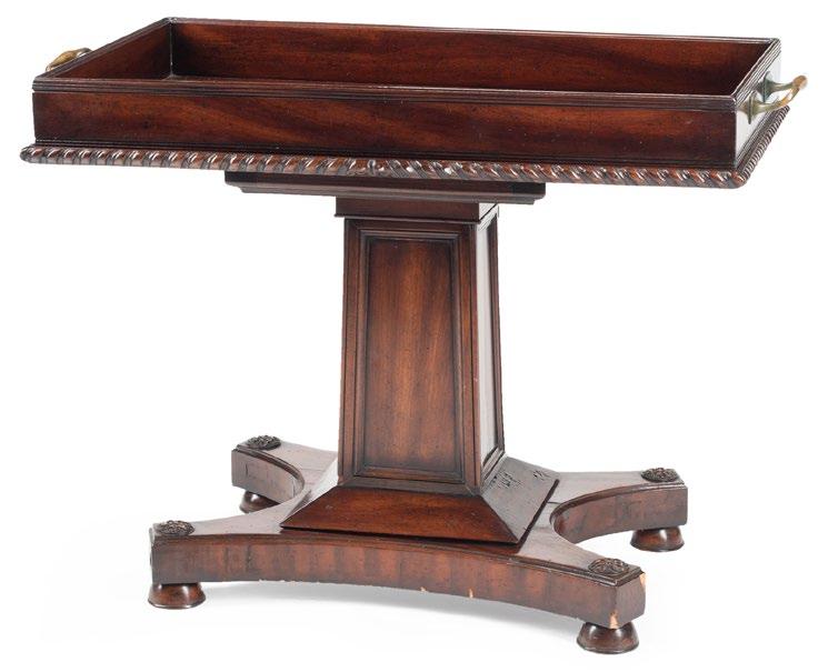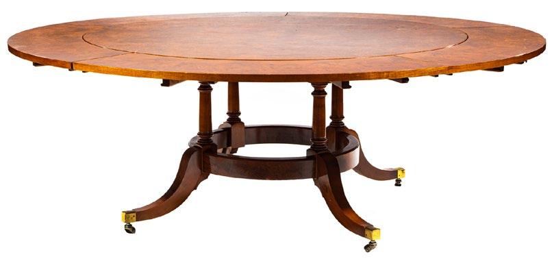 30. American Classical Mahogany Two-Part Pedestal Dining Table, c. 1840, New York, each with drop-leaf, bolection frieze, columnar standard, shaped plinth, bossed scroll feet, casters, h. 29 in., w. (closed) 41 in., w. (open) 80 1/2 in., d. 20 1/4 in. [$800/1200]