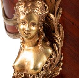 frieze centered by a maiden mask cartouche, scrolled cabriole legs surmounted by mythological masks, scrolled X-stretcher centered by an abundant floral basket, scrolled toes, h. 34 1/2 in., w. 52 1/2 in., d. 33 in.