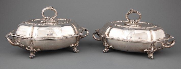 39. Pair of Georgian Sheffield Plate Entrée Dishes with Warming Stands, Roberts, Cadman & Co., Sheffield, founded 1785, fully marked with bell trademark, shaped oval form, covers with engraved crest in inset silver shield, foliate scroll handles, borders and feet, rolled edges throughout, warming stands retain original tinned interiors, h. 7 1/2 in., w. 13 1/2 in., d. 10 1/2 in. [$400/600]