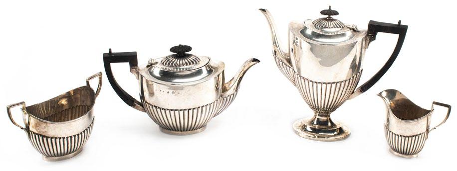 42. Edwardian Sterling Silver Four Piece Coffee and Tea Service in the Regency Taste, W.G. Keight and Co., Birmingham, 1902 & 1903, incl. coffee pot (h. 9 3/4 in.), teapot, open sugar and creamer, with part-reeded bodies, total wt. 47.85 troy ozs. [$400/600]