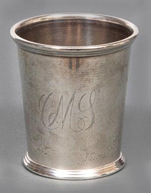 44. American Coin Silver Julep Cup, by Peter Krider, Philadelphia c. 1850; ret. William Kendrick, Louisville, KY, tapered body with molded rims, script monogram, h. 3 5/8 in., wt. 4.90 troy ozs. [$200/300]