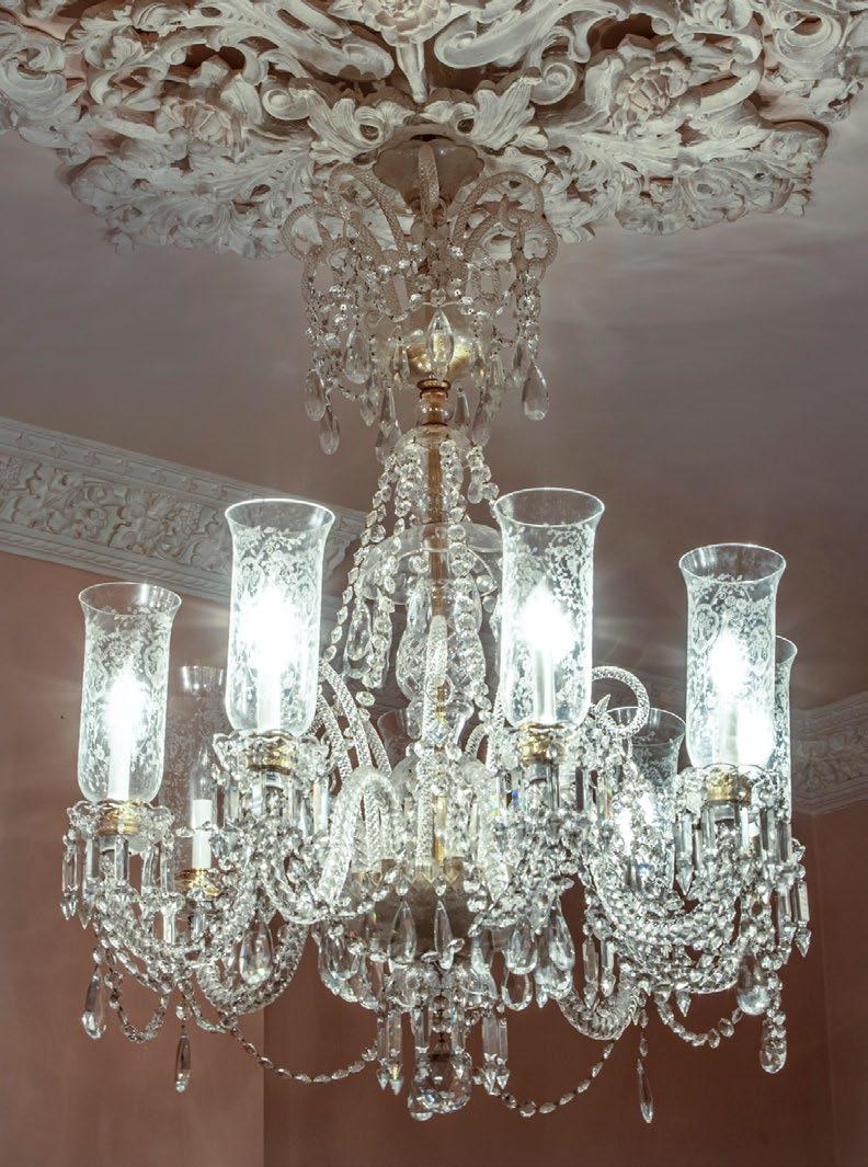 20. Fine Pair of American Cut Crystal Eight-Light Chandeliers, shepherd’s crooks hung with beads, twist arms, hurricane shades, electrified, h. 49 in., dia. 36 in. [$2000/3000]