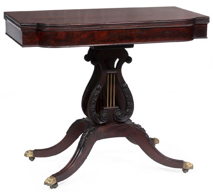 32. American Classical Carved Mahogany Games Table, early 19th c., attr. to Thomas Wightman, Boston, shaped foldover top with molded edge, conforming frieze, foliate-scrolled lyre support with inset brass rods, molded acanthine sabre legs, brass paw feet, casters, h. 30 1/2 in., w. 36 1/2 in., d. 19 in. [$700/1000]