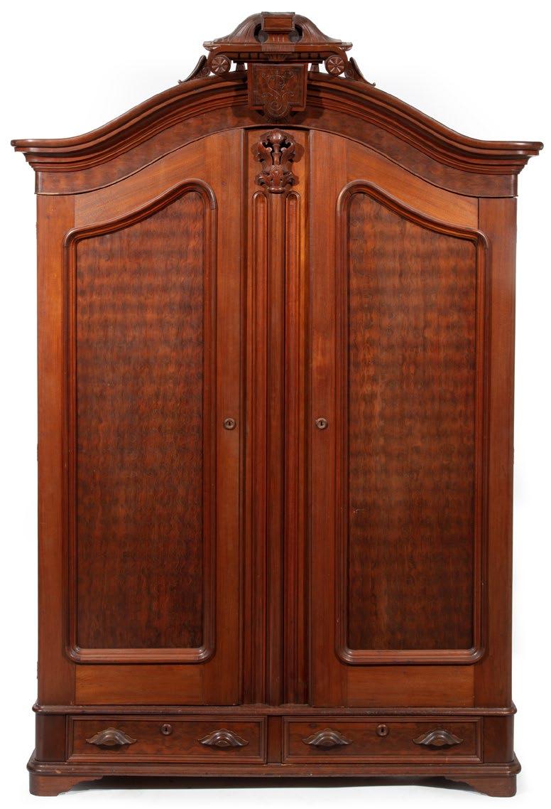 11. American Renaissance Carved and Burl Walnut Armoire, 19th c., arched pedimented cornice with incised cartouche, arched burled paneled doors, fixed center stile topped by a foliate capital, drawer base, bracket feet, h. 107 in., 74 in., d. 29 in. [$700/1000]