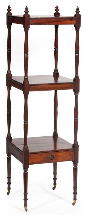 33. American Federal Rosewood and Mahogany Etagere in the Sheraton Taste, early 19th c., probably Boston, cedar secondary wood, acorn finials, baluster-turned supports and legs, lower drawer, brass cuffs, casters, h. 52 1/2 in., w. 16 in., d. 16 in. [$600/900]