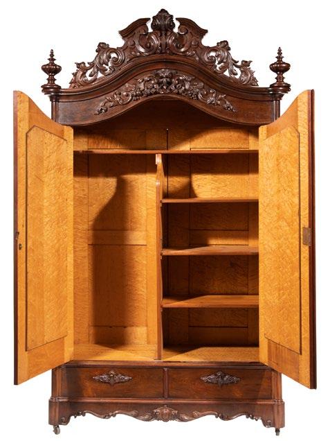 2. American Rococo Carved Rosewood Double Door Armoire, mid-19th c., attr. to retailer Prudent Mallard, New Orleans, lobed finials, egg-and-dart cornice with floral urn crest, mirrored doors, stiles with foliate scrolled acorn brackets, maple interior with medial belt of drawers, conforming base with drawer, disc feet, h. 120 in., w. 75 in., d. 27 in. [$4000/6000]