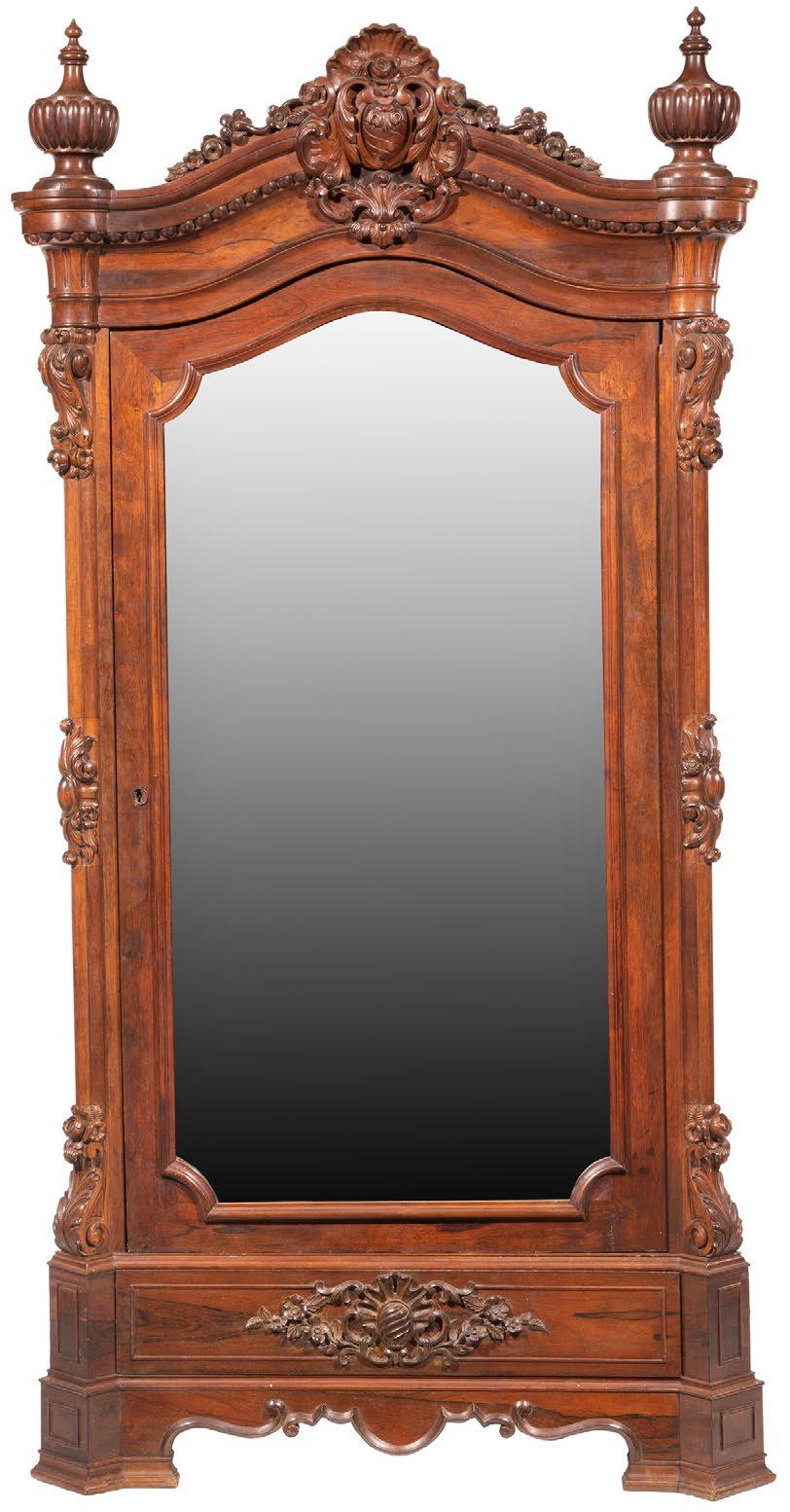 18. American Rococo Carved Rosewood Armoire, 19th c., probably from the shop of noted purveyor Prudent Mallard, New Orleans, arched cornice, floral and grape carved frieze, turreted sides with barber pole carving, conforming mirror doors, divided maple interior, carved molded base with two drawers, bracket feet, h. 111 in., w. 59 on., d. 22 in. [$1500/2500]
