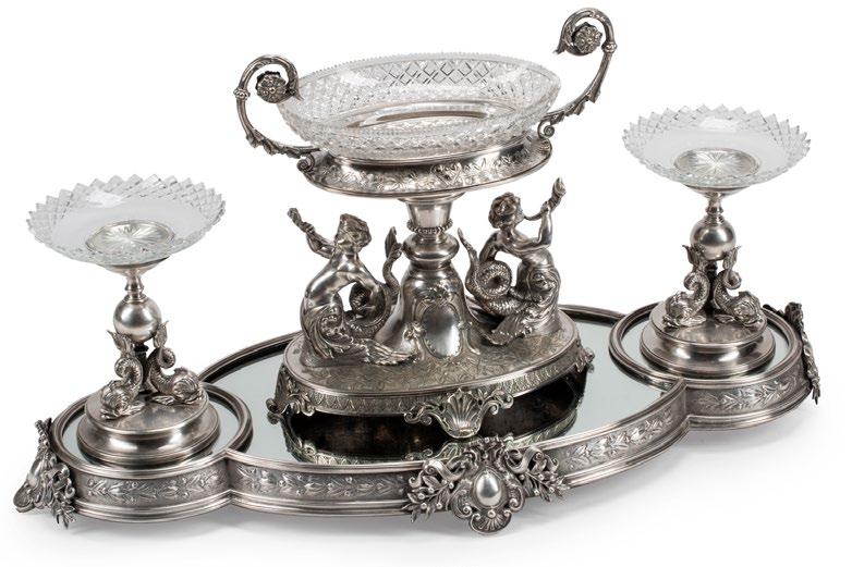 41. George IV Sterling Silver Footed Tray, Rebecca Emes & Edward Barnard I, London, 1825, act. 1808-1827, circular with robust shell and scroll border and feet, flat chased well centering presentation inscription to Isaac Forsyth, Esquire from the Morayshire Farmer Club, Elgin, January 5, 1827, dia. 18 1/4 in., wt. 86.85 troy ozs. [$1500/2500]