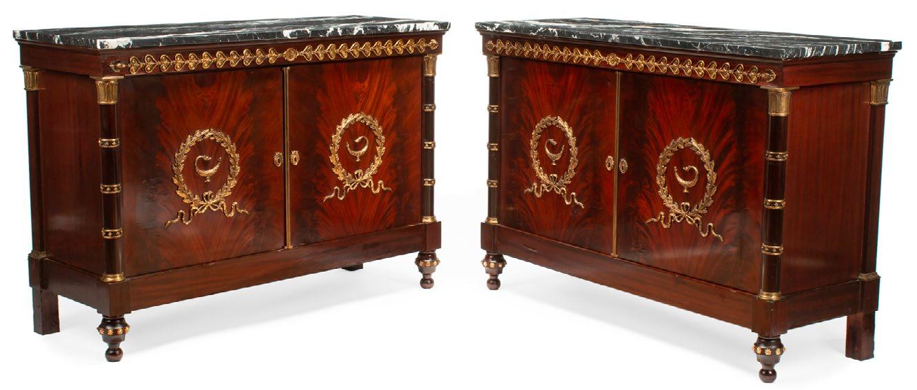 5. Rare Pair of American Renaissance Carved Mahogany Consoles, mid-to-late 19th c., probably New York, Egyptian faux marbre top, fluted backsplash and frieze, robustly carved scrolled acanthine supports, conforming plinth, acanthus paw feet, h. 39 in., w. 36 1/2 in., d. 22 in. [$3000/5000]