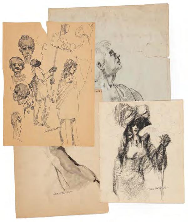 48. Don Wright (American/Louisiana, 19382007), “Figure Studies”, 4 pen and inks on paper, 4 charcoals on paper, 3 graphites on paper, 4 mixed medias on paper, one pastel on paper, 14 signed, 5 with sketches en verso, 7 1/2 in. x 5 in. to 12 in. x 9 in., all unframed. (16 pcs.) [$200/300]