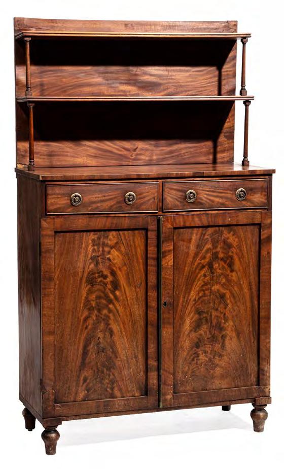 26. Regency Carved Mahogany Chiffonier, early 19th c., two tier superstructure, two drawers over paneled door cabinet, h. 37 3/4 in., w. 33 1/2 in., d. 14 in. Note: Condition. [$700/1000]