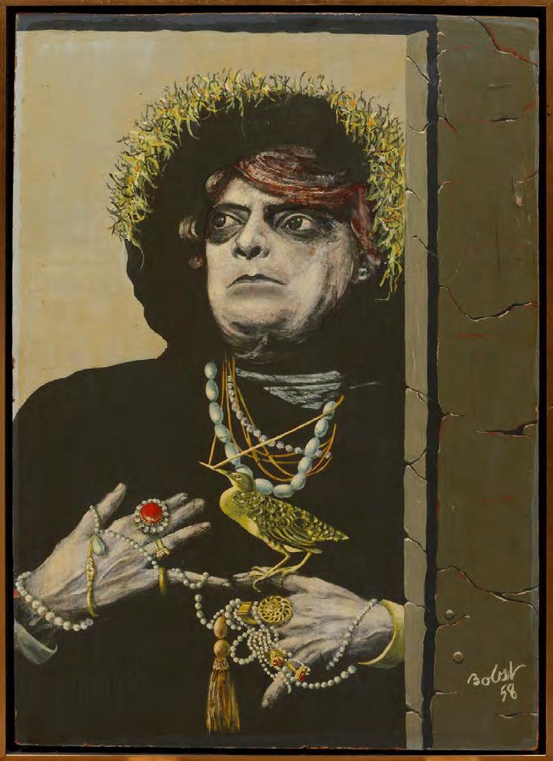 69. Tucker Bobst (American, 1923-2008), “Making a Nest”, 1958, oil on masonite, signed and dated lower right, “Capo Auctions” tag attached en verso, “Backwoods Gallery, St. Francisville, LA” label on backing paper, 28 in. x 20 in., framed, overall 29 3/8 in. x 21 1/2 in. x 2 in. [$100/200]