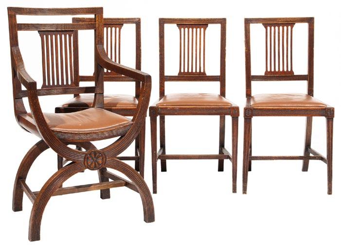 , late 19th c., incl. 2 Savonarola-style armchairs, curule x-form supports, h. 37 in., w. 23 1/2 in., d. 19 1/8 in.; and 6 side chairs, h. 34 5/8 in., w. 18 in., d. 19 1/4 in. Note: repairs to 1 armchair [$700/1000]