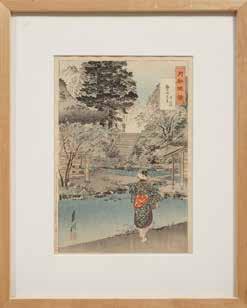 422. Two Japanese Woodblock Prints, incl. Ogata Gekko (18591920), depicting a female figure before water and a staircase, sight 13 1/4 in. x 9 1/4 in.; and Imao Keinen (1845-1924), depicting a bird on a winter branch, sight 12 7/8 in. x 9 1/4 in., each matted and framed.
