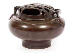 415. Chinese Patinated Bronze Covered Censer, loop handle terminating in ruyi heads, pierced cover with phoenix bird, compressed globular body, h. (excl. handle) 4 in., w. 5 1/2 in., d. 5 3/8 in. [$200/400]