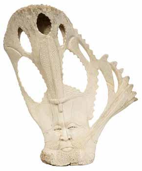 394. Chinese Grayish-White Glazed Stoneware Brush Rest, modeled in the form of a dragon’s head with upturned horns, h. 5 3/4 in., l. 8 1/2 in.; presented on acrylic and brass lamp stand, h. (incl finial) 21 in., w. 9 in. d. 6 in. [$300/500]