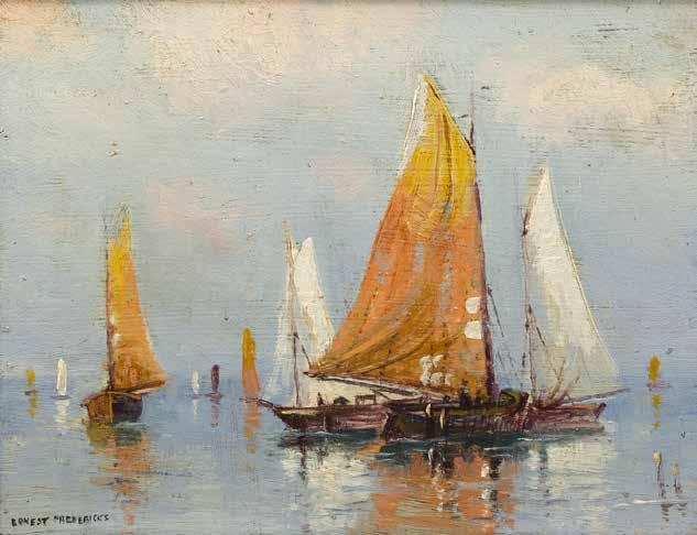60. Ernest T. Fredericks (American/Arkansas, 1877-1959), “Sailboats”, oil on canvas board, signed lower left, “Dunning’s, Elgin, IL” tag en verso, 11 in. x 14 in., framed, overall 13 5/8 in. x 16 5/8 in. x 1 3/8 in.