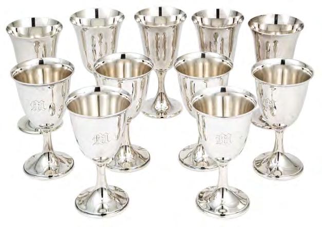 54. Associated Set of Eleven American Sterling Silver Water Goblets, mid-20th c., incl. 6 Kirk, no. 4108, monogrammed “M”, h. 6 in.; and 5 Gorham, no. 272, no monogram, h. 6 1/2 in.; total wt. 56 troy ozs.
