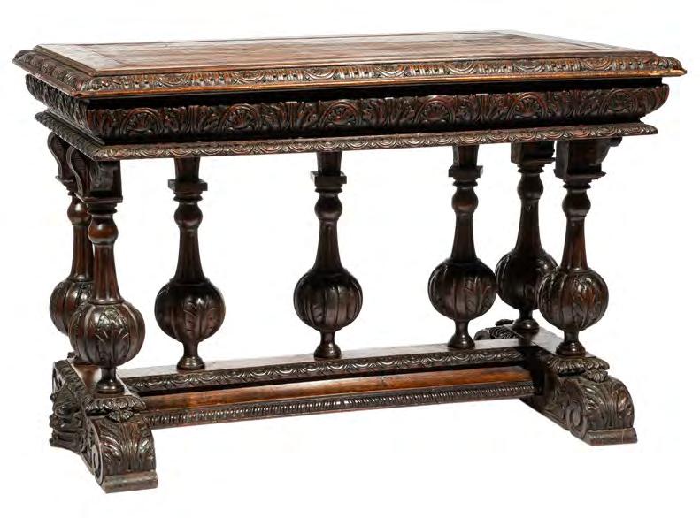 28. Continental Renaissance Revival Carved Oak Library Table, 19th c., molded top, frieze drawer, trestle base, paw feet, h. 33 in., w.47 in., d. 33 3/4 in.