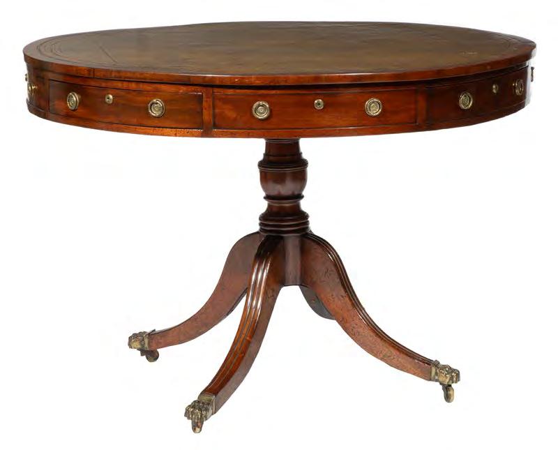 1. Regency Mahogany Rent Table, 19th c., tooled leather top, frieze drawers, turned standard, outwept legs, casters, h. 31 in., dia. 47 in.